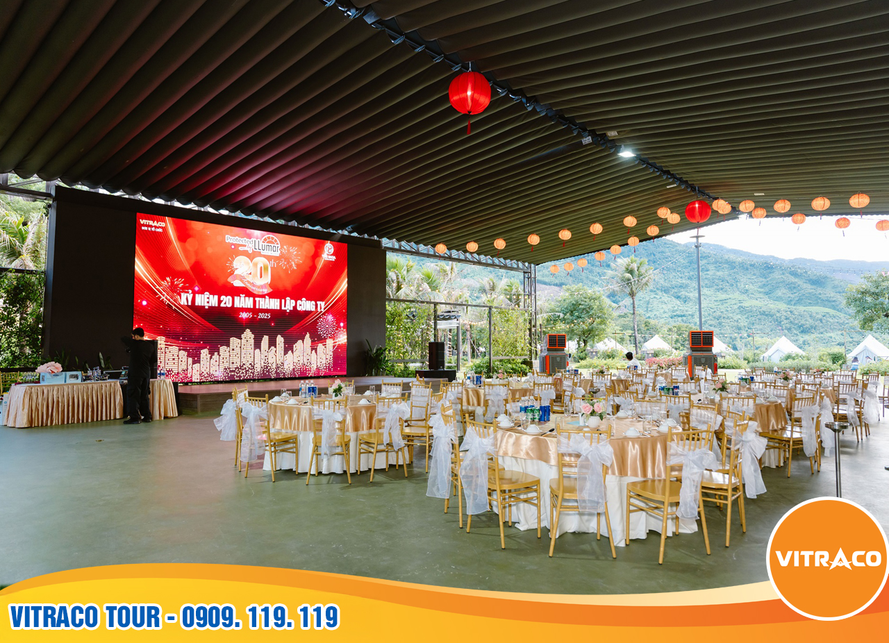 Tập hợp tại khu vực bãi cỏ rộng lớn, được bao quanh bởi rừng núi xanh mát, chương trình Team Building mang đến trải nghiệm gắn kết đầy cảm hứng. Dưới sự dẫn dắt của đội MC và hoạt náo viên chuyên nghiệp từ VITRACO, Quý khách cùng nhau vượt qua những thử thách mang tinh thần đồng đội cao, thể hiện sự phối hợp, linh hoạt và sáng tạo.