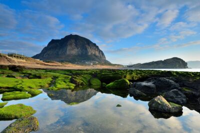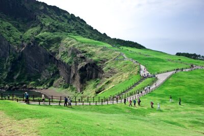 - Đỉnh Seongsan – Ilchubong (đỉnh núi mặt trời mọc – Sunrise Peak): là một điểm đến lý tưởng cho những ai yêu thích sự lãng mạn. Còn gì tuyệt vời hơn khi được ngắm mặt trời mọc từ miệng núi lửa yên bình, đón chào những tia nắng bình minh trên cánh đồng cỏ xanh ngát với tiếng rì rào từ sóng biển.