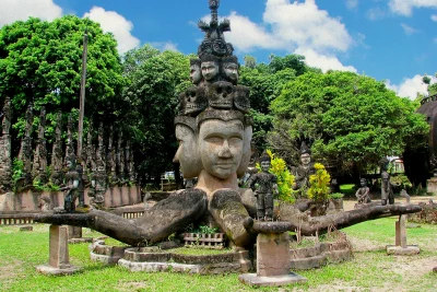 Xe và HDV đưa đoàn đi thăm Vườn tượng Phật Wat Xiêng Khuôn, toạ lạc bên dòng sông Mê Kông hùng vĩ, xây dựng theo kiến trúc kinh đô Phật giáo ở Ấn Độ được Đức Như Lai sắc phong khi còn tái thế.