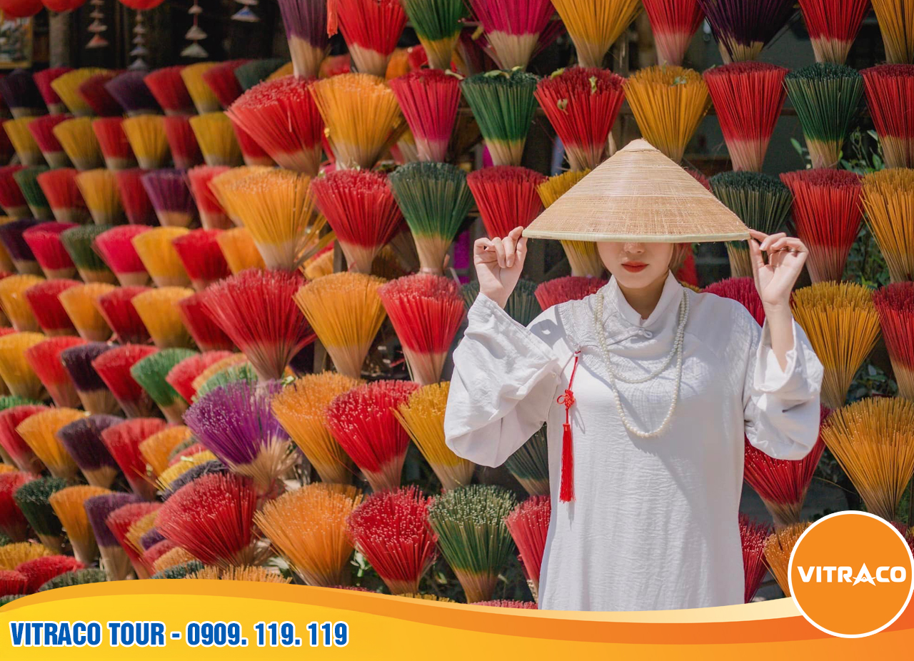 Tiếp tục hành trình, đoàn ghé Làng hương Thủy Xuân – làng nghề truyền thống hơn 700 năm tuổi, chuyên làm hương trầm. Con đường làng ngập tràn sắc màu của những bó hương được bày biện thành hình quạt, hình đóa hoa rực rỡ. Du khách sẽ được tìm hiểu quy trình làm hương thủ công, tận tay trải nghiệm thử và ghi lại những bức ảnh check-in sống động giữa không gian truyền thống đầy màu sắc.