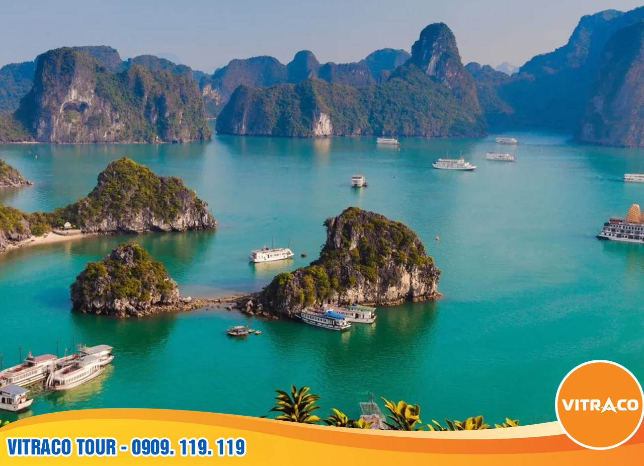 Vịnh Hạ Long – Kỳ quan thiên nhiên thế giới, với hàng nghìn đảo đá vôi kỳ vĩ giữa làn nước xanh.