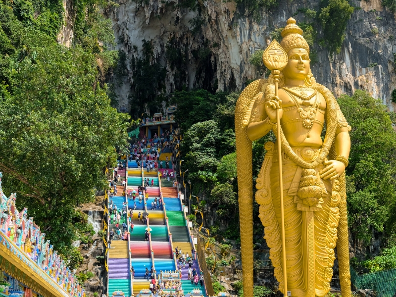 - Động Batu – nơi thờ đạo Hindu thiêng liêng của người Ấn Độ cổ với 272 bậc thang dẫn đến đền thờ trong động. Có tượng thần Murugan cao 43m được sơn nhũ vàng lấp lánh, đứng trước lối vào động và để chiêm ngưỡng sự huyền bí của hang động.